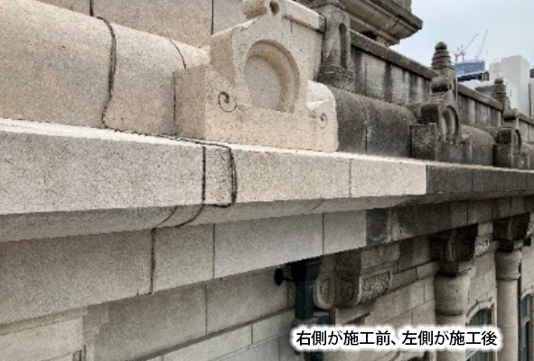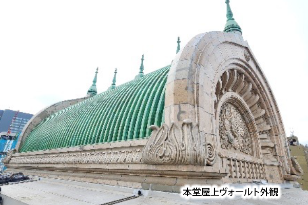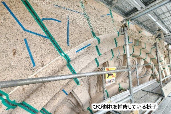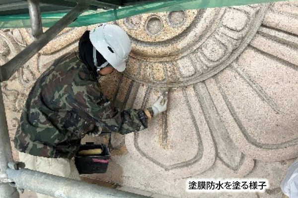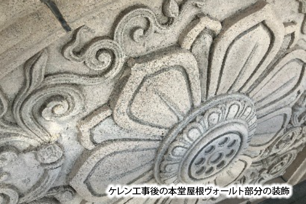 吹付塗装を削ることによって、創建当初の外壁が出てきましたが、経年によりひびが入っていたり、過去に補修した後が出てきており、ひび割れている箇所には補修剤を塗り修繕していきます。補修後、今回の工事では、以前のような吹付塗装ではなく、創建当初の壁面を現しつつ、今後のメンテナンス効率を考慮して、透明な塗膜防水剤を塗る方法を採用しました。そのおかげか、屋上ヴォールト屋根の装飾が境内からでもはっきり見えるようになっています。