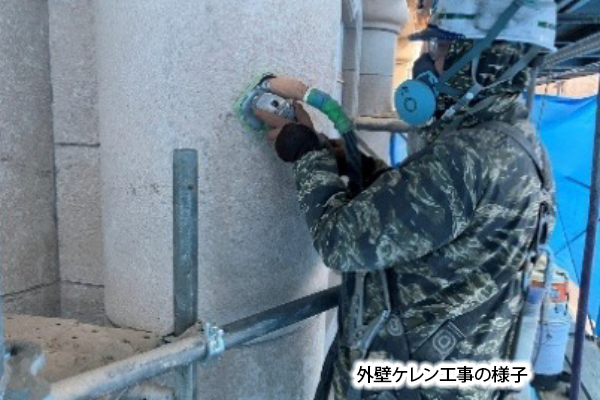 築地本願寺は過去に何度か外壁の補修工事をしており、以前の工事では外壁の補修した後、表面に美装化のためザラザラした天然石調の吹付塗装をしていました。おそらく当初は創建当時の色に合わせていたのでしょうが、経年により汚れがたまり黒くなっており、この表面の吹付塗装を削るため、器具を使用して職人の手作業で、外壁を削る外壁のケレン工事を行いました。特に、装飾部分は余計に削ってしまわないよう、職人の丁寧な作業によって進められ、創建当時の綺麗な色をした外壁が出てきています。