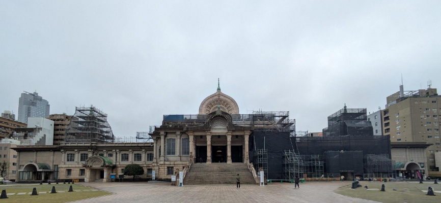 現在(4月上旬)の工事状況は、本堂向かって右側の外壁に足場を組み補修工事を行っています。この外壁補修工事は順番に足場を組み替えて行っていきますので、現在の足場が取れると左右で工事前、工事後と見比べることができます。徐々に綺麗になっていく築地本願寺の姿をお楽しみください。